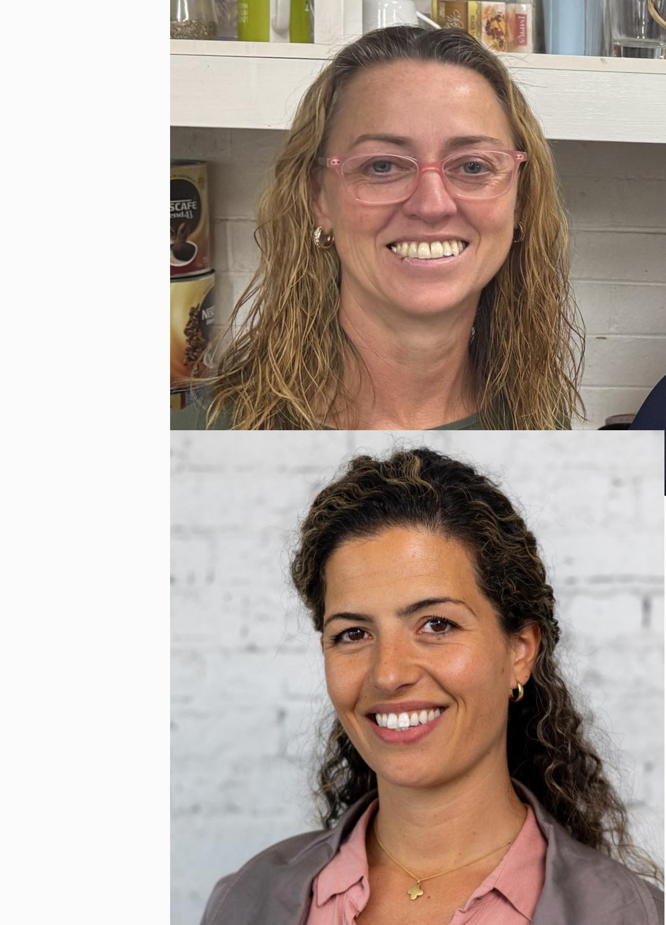 Jane is smiling, she has light, mid-length hair and pink glasses and Aline is smiling, she has dark curly hair. Jane is smiling, she has light, mid-length hair and pink glasses and Aline is smiling, she has dark curly hair.
