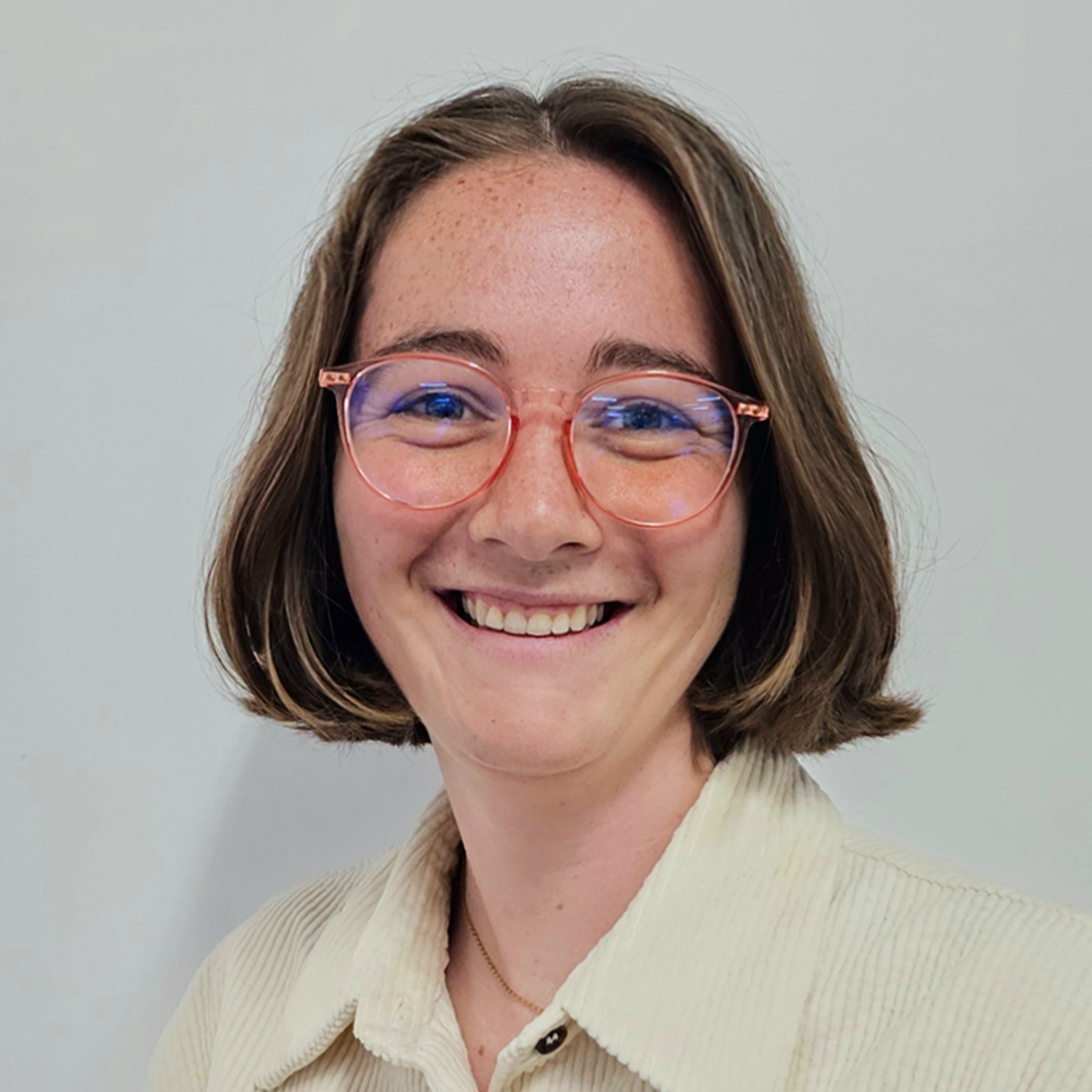 Annaliese has shoulder length brown hair is wearing glasses and a colourful shirt