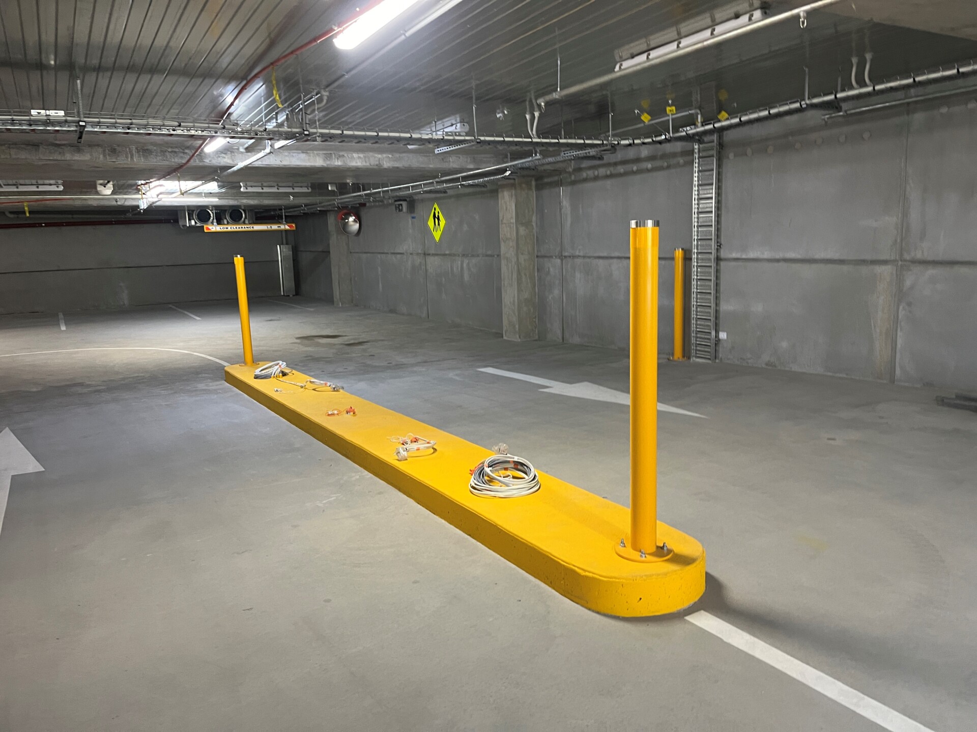 Yellow bollards in an undercover car park Yellow bollards in an undercover car park