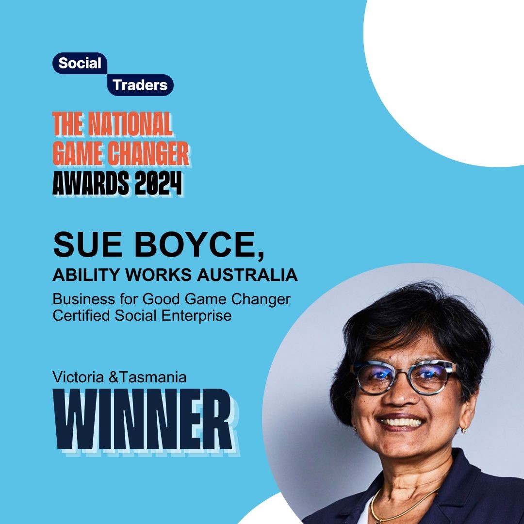 In June 2024 Sue Boyce and Ability Works were awarded the Social Traders’ Business for Good Gamechanger Vic/Tas award for achievements in employment expansion, innovation and technology, and advocacy and support. Board member James Edmonds attended the event and accepted the award on Sue’s behalf, as she could not attend.