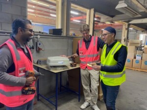Image description: Jackson and Hasan from Transurban’s Digital Team learn about our work in assembling HVAC units from Andrew, Senior Supervisor of Manufacturing.